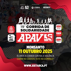 A Associação Portuguesa de Apoio à Vítima (APAV) convida todas as pessoas interessadas a participar na 19.ª Corrida de Solidariedade APAV, que se realiza este ano no Parque Florestal de Monsanto, em Lisboa, no dia 11 de outubro. Esta edição marca os 35 anos da APAV, celebrando as conquistas alcançadas e as vidas positivamente impactadas […]