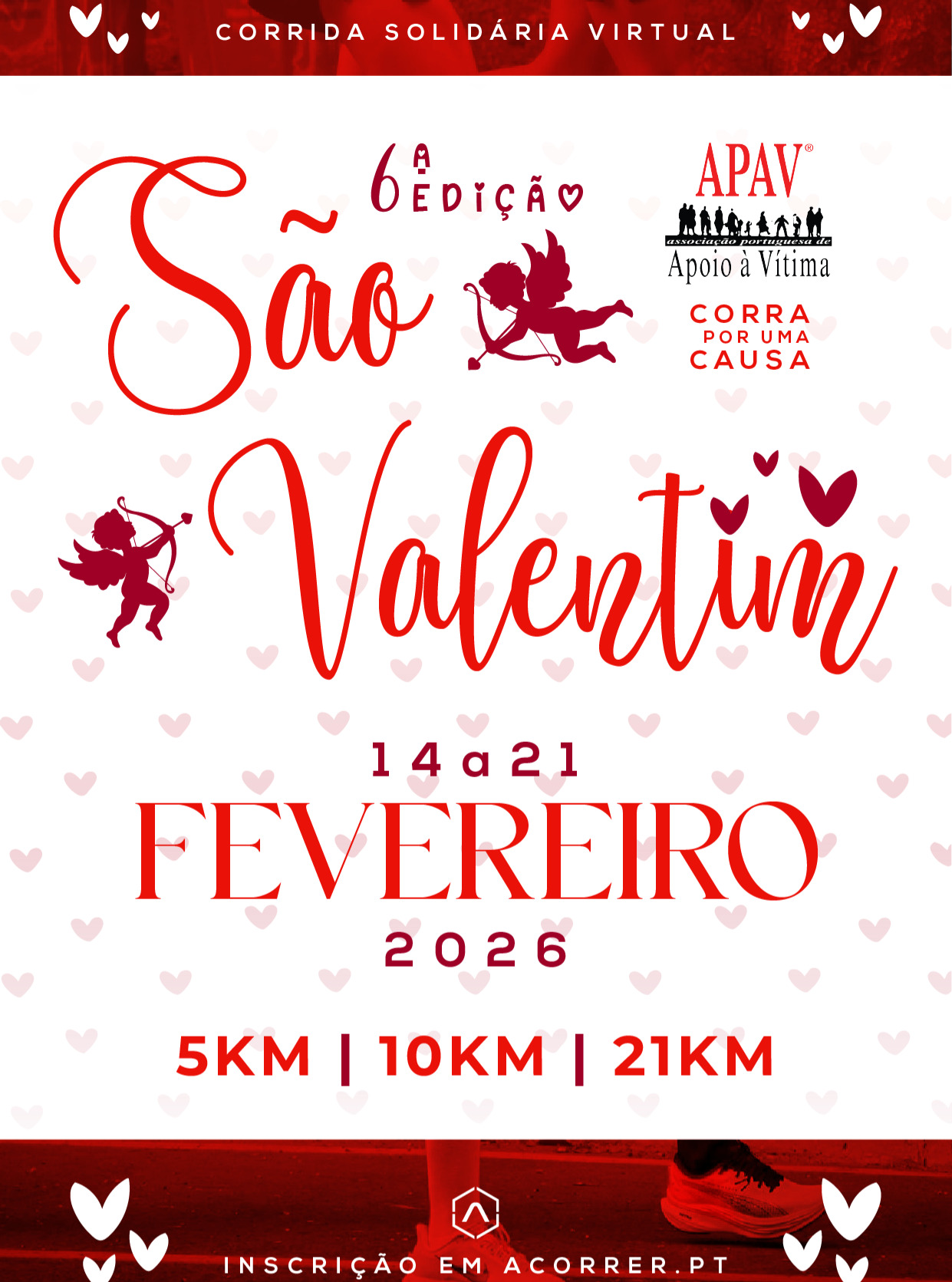 De 14 a 21 de fevereiro, junta-te à 6.º Corrida Solidária Virtual — São Valentim, uma iniciativa que alia o desporto à solidariedade e ao amor pelo próximo. Ao participar, estará a apoiar a APAV — Associação Portuguesa de Apoio à Vítima, contribuindo para a luta contra a violência doméstica e a violência no namoro.