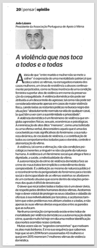 A APAV reage, no Diário As Beiras, ao artigo de opinião “A Violência Doméstica”, publicado no mesmo jornal no dia 4 de Março. Intitulado “Violência Doméstica”, o artigo de opinião atribui um efeito causador do aumento do número de mortes à categorização da violência doméstica como crime.
