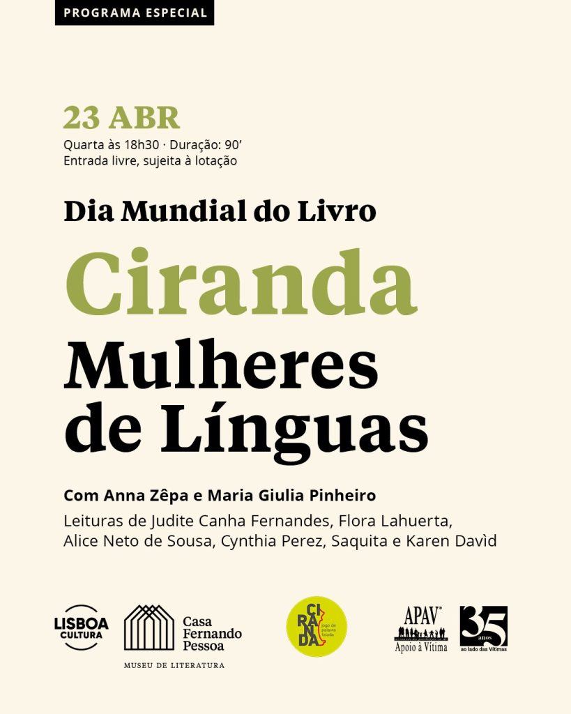 No âmbito das comemorações dos seus 35 anos, a APAV associa-se ao evento “Ciranda: Mulheres de Línguas”, que terá lugar no próximo dia 23 de abril, às 18h30, na Casa Fernando Pessoa, em Lisboa.