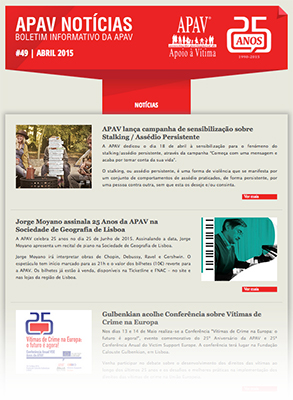 A newsletter APAV Notícias, boletim informativo da APAV, foi reformulada através de uma reestruturação a nível gráfico e de organização de conteúdos, com o apoio da empresa Último Take. A newsletter apresenta um resumo das actividades da APAV, sendo distribuída com regularidade mensal.A 49ª edição da newsletter condensa informação sobre: a nova campanha de sensibilização sobre stalking / assédio persistente; o concerto de Jorge Moyano na Sociedade de Geografia de Lisboa, no dia do 25º aniversário da APAV; a Conferência “Vítimas de crime na Europa: O futuro é agora!”, que se realiza nos dias 13 e 14 de Maio; e a associação do IndieLisboa aos 25 Anos APAV. A nova newsletter inclui ainda vários destaques.