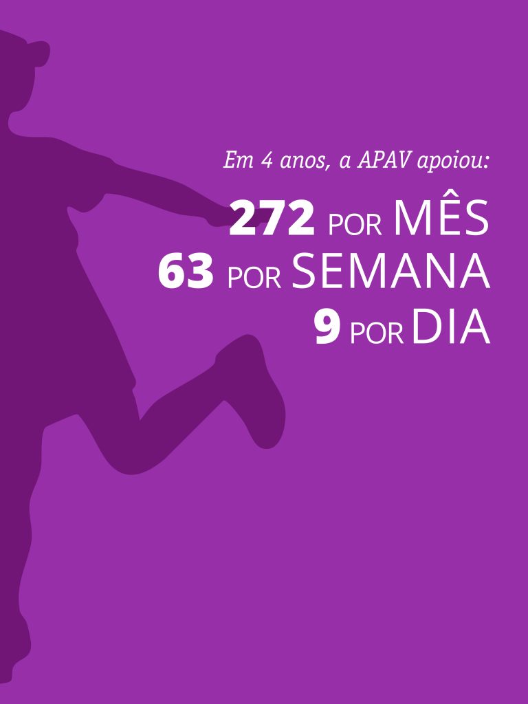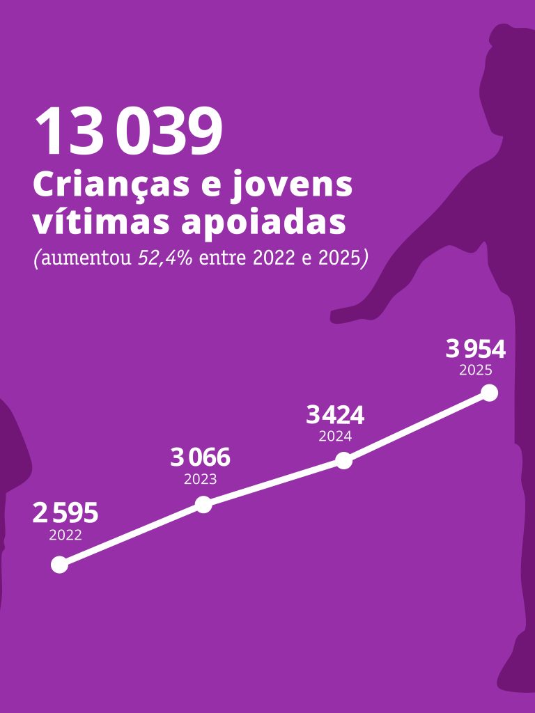 Entre 2022 e 2025, a APAV apoiou um total de 13.039 crianças e jovens vítimas de crime e violência, o que representa um aumento de 52,4% ao longo deste período. Em média, a APAV apoiou 272 crianças e jovens por mês, o equivalente a 63 por semana e 9 por dia.