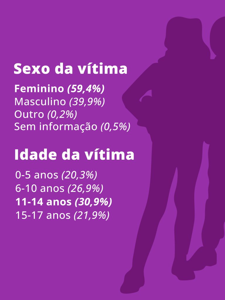 Do ponto de vista demográfico, a maioria das vítimas é do sexo feminino (59,4%), seguindo-se o sexo masculino (39,9%), sendo residual a percentagem de situações com outra identificação de género ou sem informação. Relativamente à idade, verifica-se uma maior incidência entre os 11 e os 14 anos (30,9%), seguidos do grupo dos 6 aos 10 anos (26,9%), das crianças entre os 0 e os 5 anos (20,3%) e dos jovens entre os 15 e os 17 anos (21,9%).