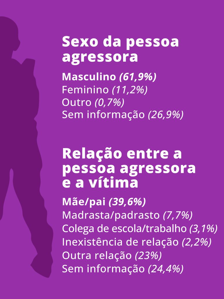 Entre 2022 e 2025 foram identificadas pessoas agressoras maioritariamente do sexo masculino (61,9%), sendo que, em 39,6% das situações, a pessoa agressora é a mãe ou o pai, o que evidencia a proximidade entre vítima e agressor.