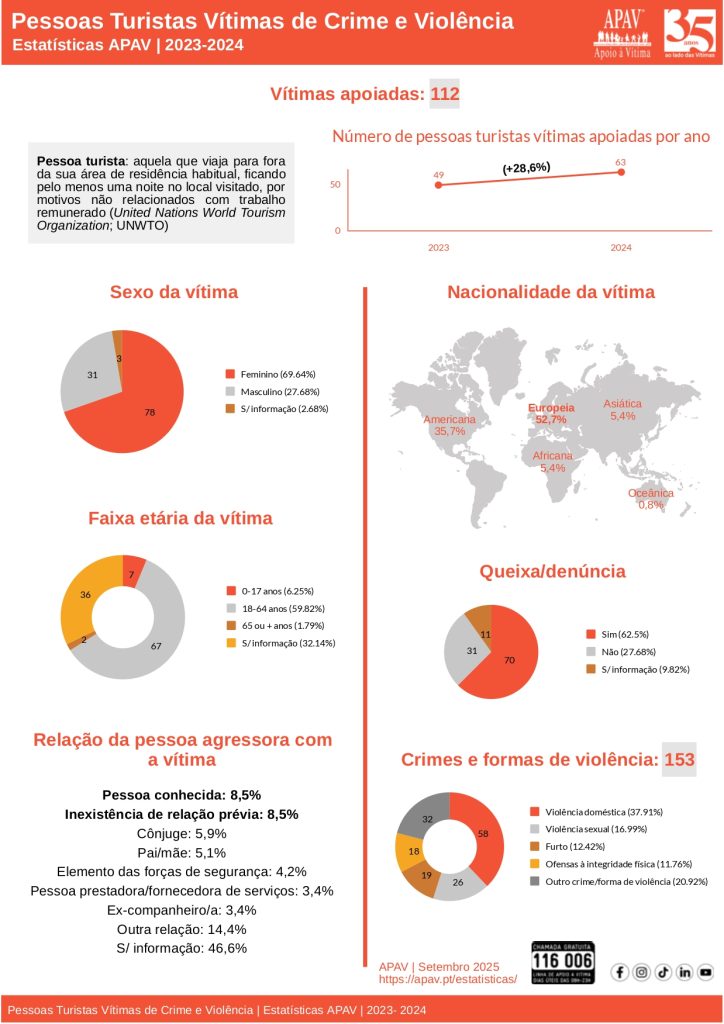 A Associação Portuguesa de Apoio à Vítima divulga as Estatísticas APAV | Pessoas Turistas Vítimas de Crime e Violência no período compreendido entre 2023 e 2024,revelando uma realidade que exige atenção às respostas de apoio especializado e prevenção junto de visitantes estrangeiros e nacionais.