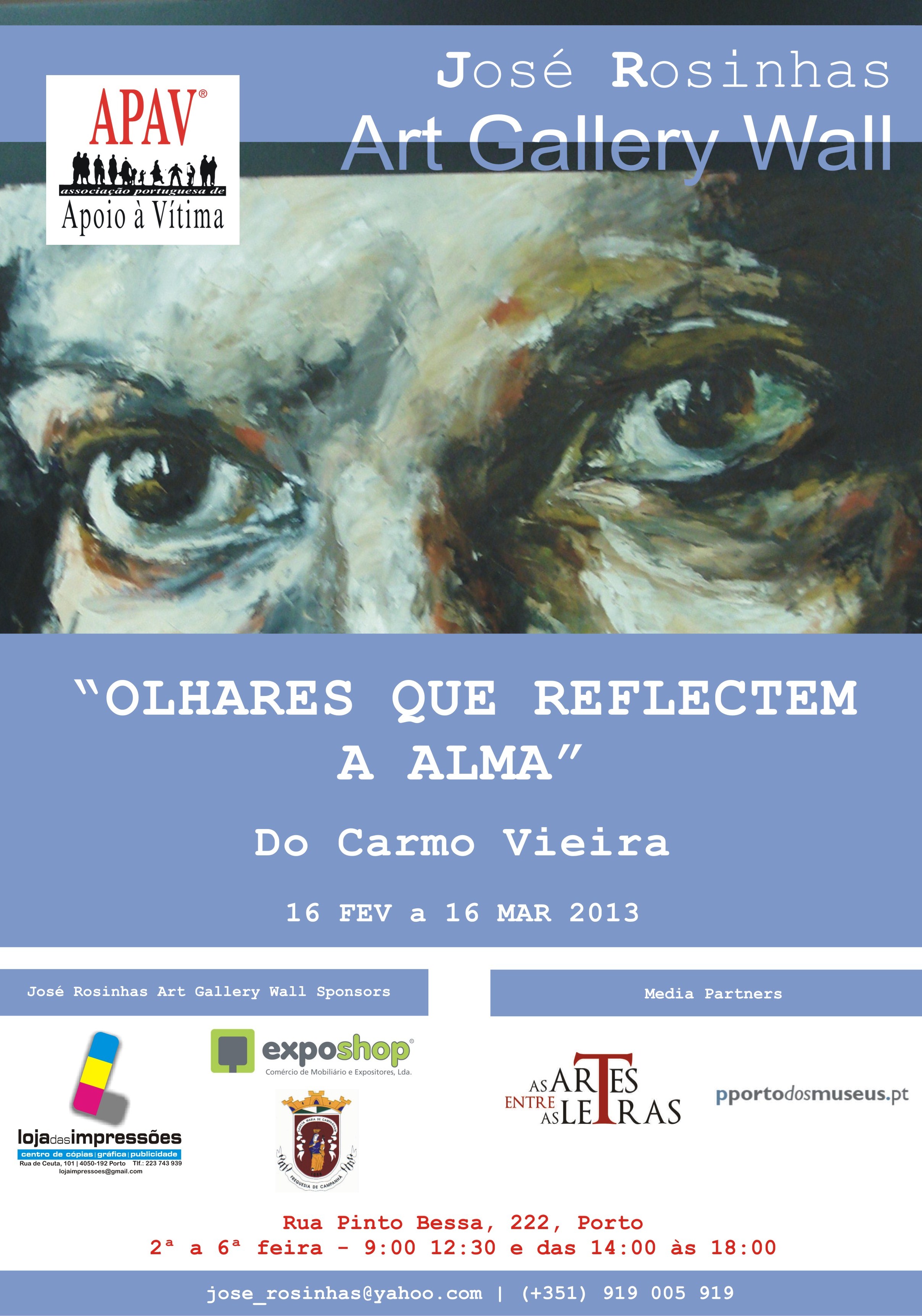 A José Rosinhas Art Gallery Wall promove a exposição “Olhares que reflectem a alma”, em colaboração com a APAV. Reunindo um conjunto de trabalhos da artista Do Carmo Vieira, esta exposição aborda a temática da violência doméstica.