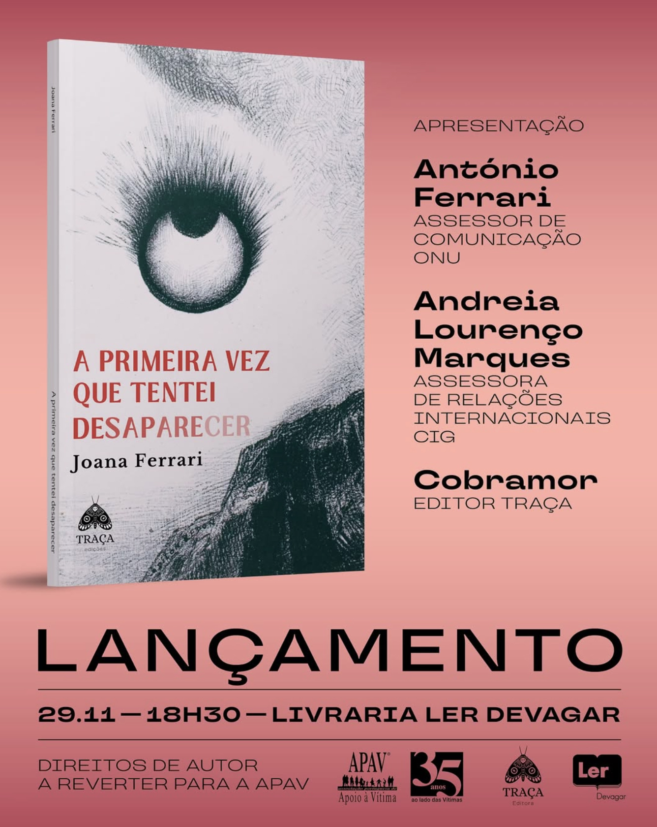 A escritora Joana Ferrari vai apresentar o novo livro “A primeira vez que tentei desaparecer”, com edição da Traça Edições. O livro será apresentado no dia 29 de novembro, às 18h30, na Livraria Ler Devagar, em Lisboa, numa sessão que contará com a participação de António Ferrari (assessor de comunicação da ONU) e Andreia Lourenço Marques (assessora de relações internacionais da CIG). Os direitos de autor deste livro revertem para a APAV.