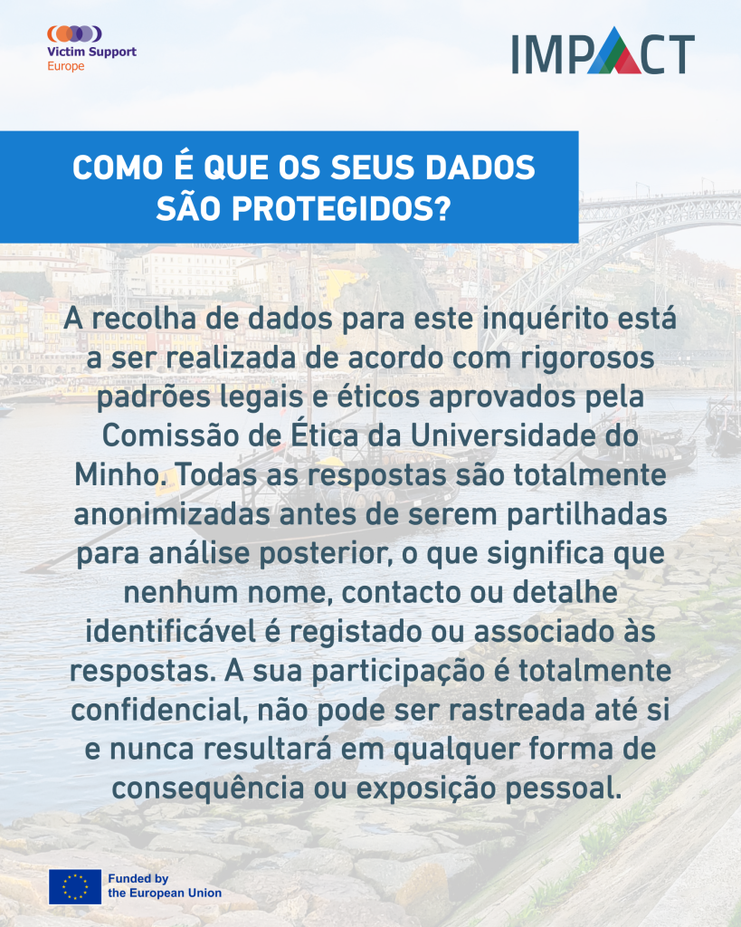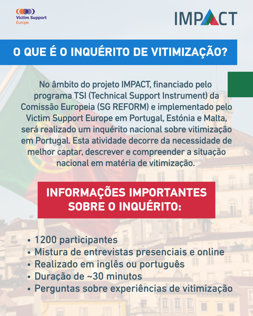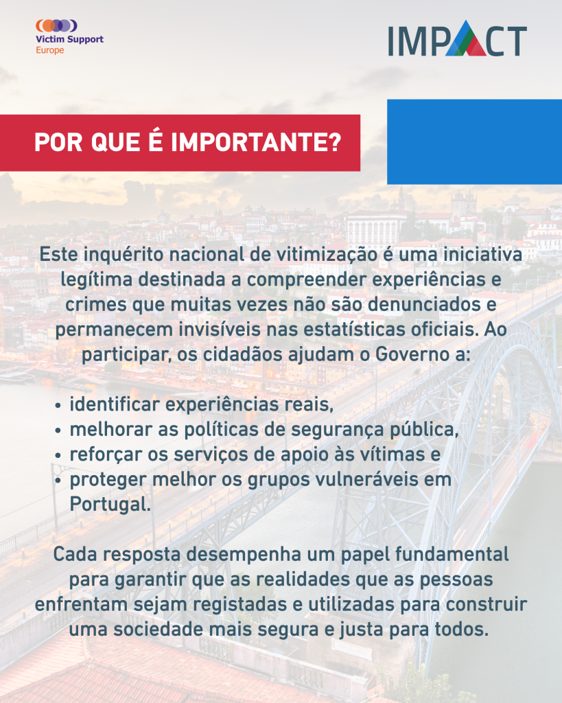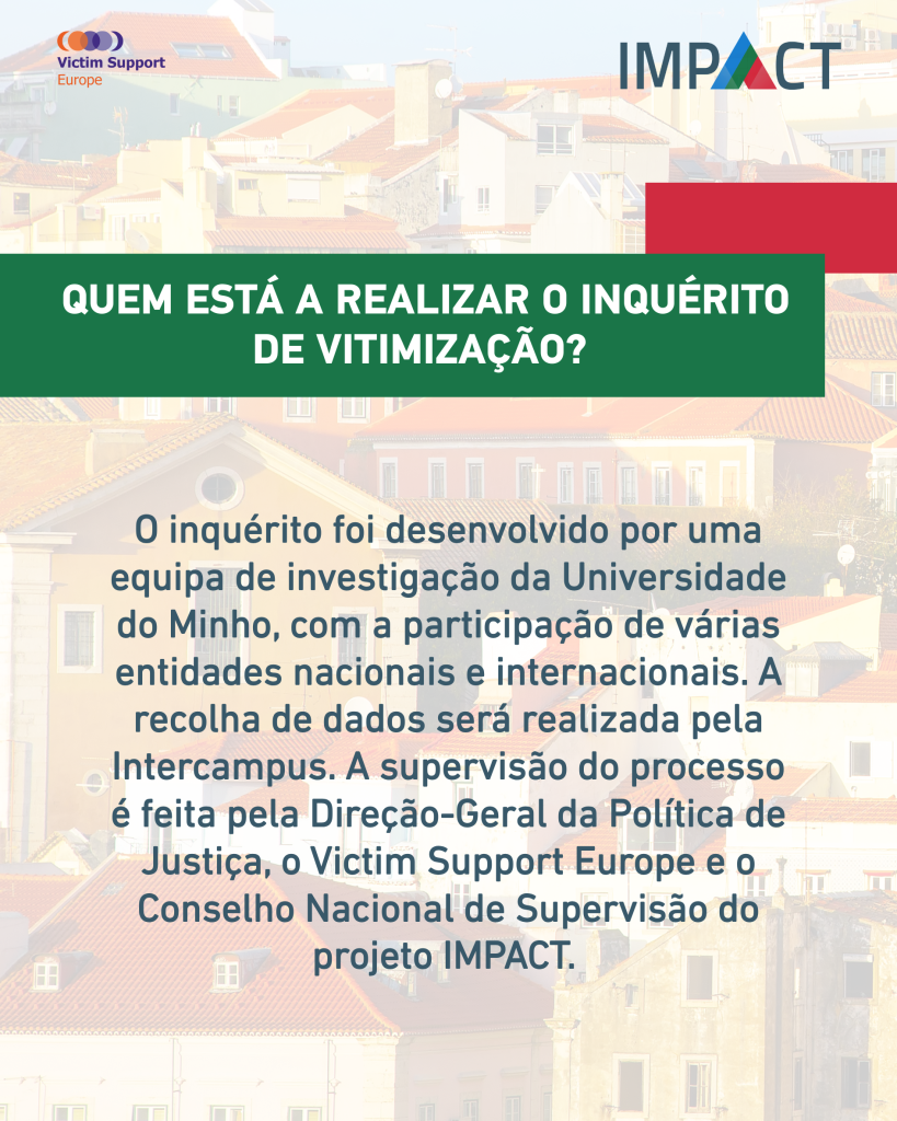 O Inquérito Nacional de Vitimização foi desenvolvido em conjunto com uma equipa de investigação da Universidade do Minho, no âmbito do projeto IMPACT. Em Portugal, o projeto é supervisionado pela Direção-Geral da Política de Justiça e pela Victim Support Europe, assegurando o rigor científico, metodológico e institucional do processo.