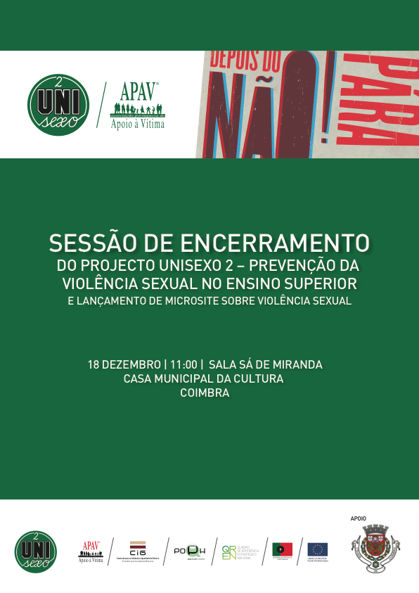 A APAV promove a Sessão de encerramento do Projecto Unisexo 2 – prevenção da violência sexual no ensino superior e lançamento de microsite sobre Violência Sexual, no dia 18 de Dezembro, às 11:00h, na Sala Sá de Miranda da Casa Municipal da Cultura, em Coimbra.