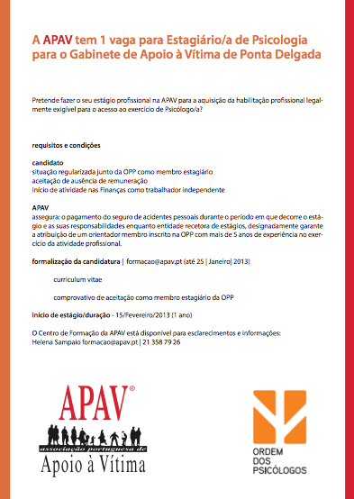 A APAV tem 1 vaga para Estagiário/a de Psicologia para o Gabinete de Apoio à Vítima de Ponta Delgada.