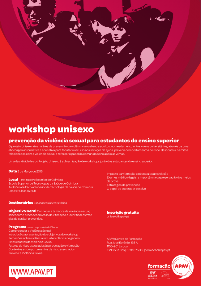 A APAV, através do Gabinete de Apoio à Vítima de Coimbra, vai dinamizar no dia 5 de Março de 2013 um workshop de prevenção da violência sexual junto dos estudantes do ensino superior.
