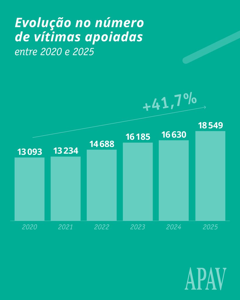 Em 2025, a APAV apoiou diretamente 18.549 vítimas, num total de 111.854 atendimentos,  somando um total de 35.341 crimes e outras formas de violência registadas. Comparativamente a 2024, estes números representam um aumento de 11,5% no número de vítimas apoiadas, de 5,8% nos atendimentos realizados e de 13,1% do aumento de crimes registados. Face a 2020, verifica-se um aumento de 41,7% no número de vítimas apoiadas.