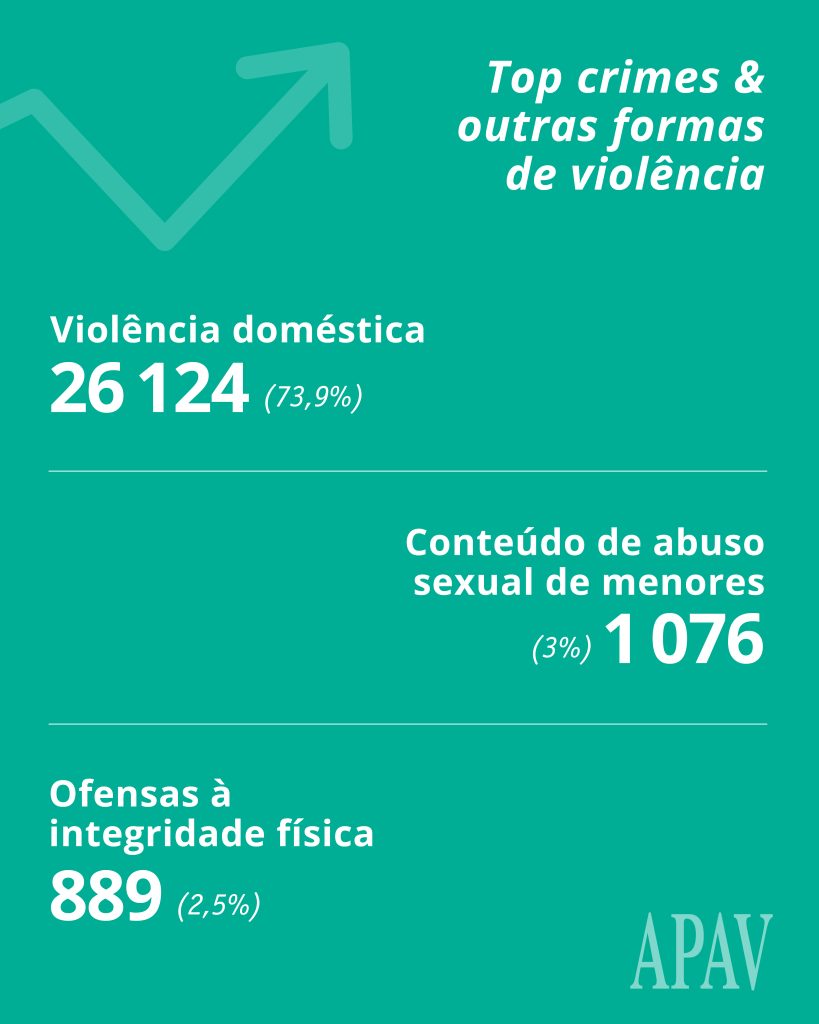 Entre os crimes e outras situações de violência registados, a violência doméstica continua a assumir um peso predominante, representando 73,9% do total. Seguem-se os crimes de partilha online de conteúdo de abuso sexual de menores (3%), entendidos como a divulgação de material digital, como imagens ou vídeos, que representa abuso sexual de crianças ou adolescentes e ofensas à integridade física (2,5%), entre outros.