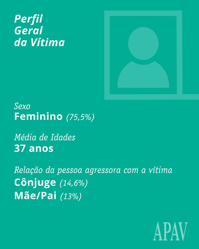 O perfil das vítimas apoiadas pela APAV é maioritariamente do sexo feminino (75,5%), com idade média de 37 anos. Na maioria dos casos, existe uma relação de proximidade entre a vítima e o agressor, designadamente conjûge (14,6%) ou mãe/pai (13%).