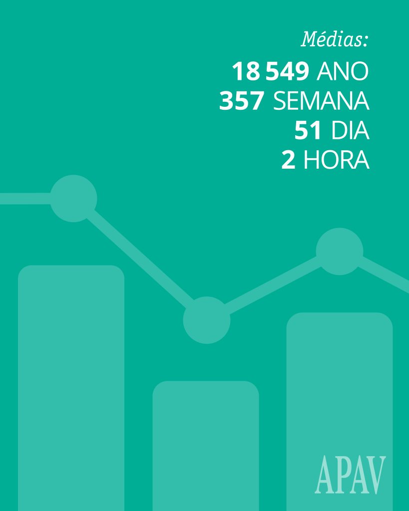 Ao longo do ano, a APAV apoiou, em média, 357 vítimas por semana. Entre estas, 199 eram mulheres adultas, 39 eram pessoas idosas, 76 crianças e 43 homens adultos. Importa ainda sublinhar que das vítimas apoiadas, 57% formalizaram uma denúncia às autoridades judiciais ou judiciárias.