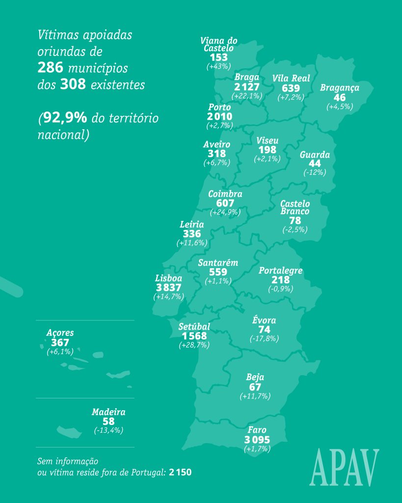 Quanto à distribuição geográfica das vítimas, esta acompanha a densidade populacional do país, verificando-se maior incidência nos distritos de Lisboa (3.837 casos registados), Porto (2.010 casos registados) e Setúbal (1.568 casos registados). Ainda assim, foram assinaladas ocorrências em 92,9% do território nacional.