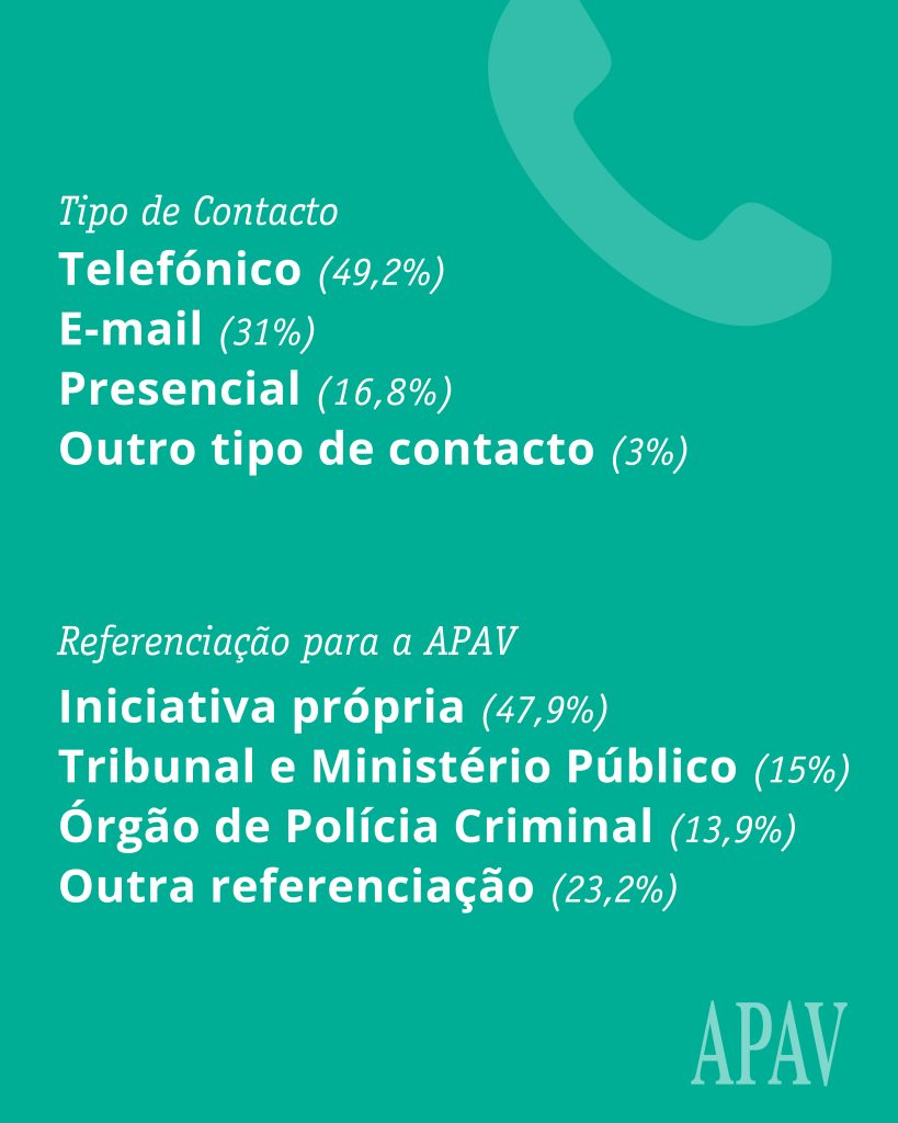Estes atendimentos foram realizados nos vários serviços de proximidade: Gabinetes de Apoio à Vítima, Equipas Móveis de Apoio à Vítima, Polos de Atendimento em Itinerância, Sistema Integrado de Apoio à Distância, Linha Internet Segura, Redes Especializadas e Casas de Abrigo.