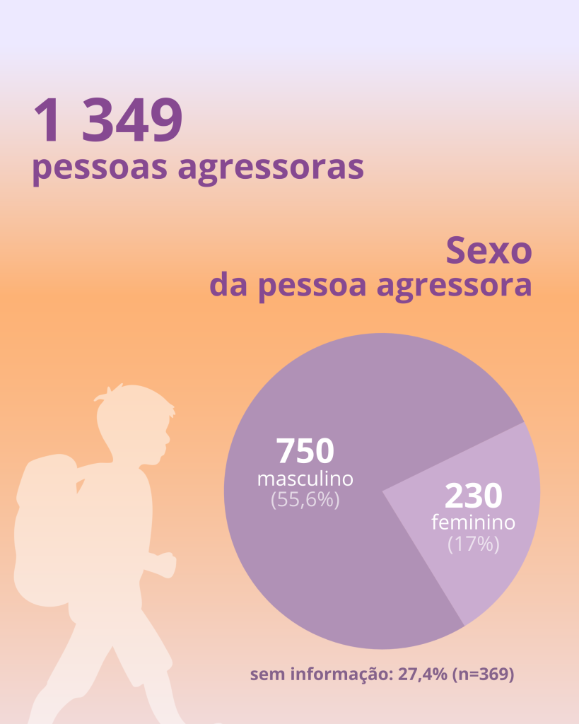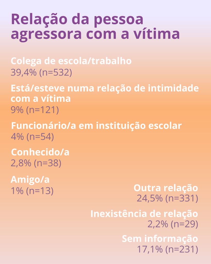 No que diz respeito ao perfil das pessoas agressoras, foram identificadas 1.349 pessoas agressoras, maioritariamente do sexo masculino (55,6%). A relação entre vítima e pessoa agressora evidencia uma forte incidência entre pares, com destaque para colegas de escola ou de trabalho (39,4%), seguindo-se outras tipologias relacionais e contextos associados à vida escolar.